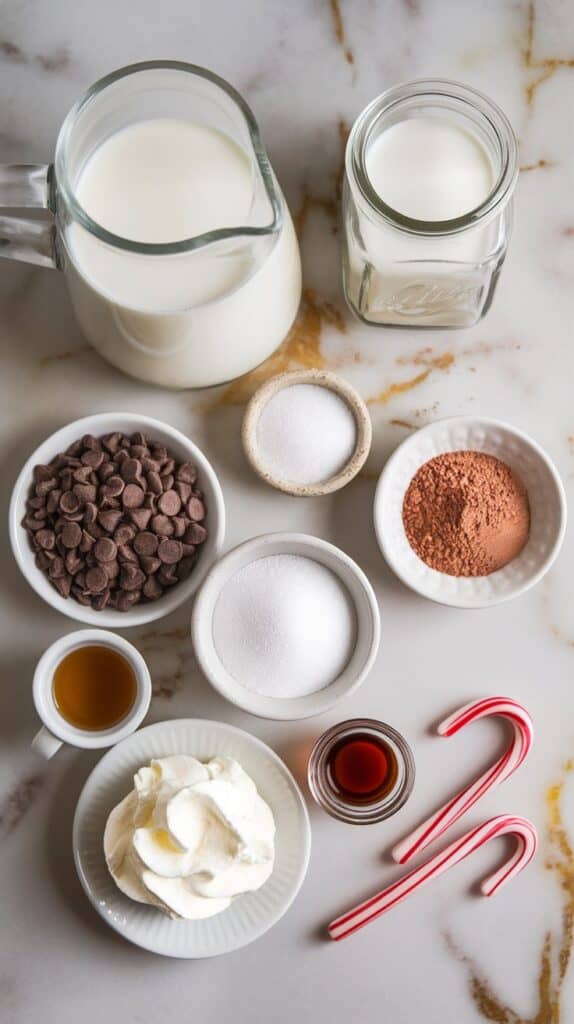 Pour the hot chocolate into mugs. Top with whipped cream and hook a mini candy cane on the side of each mug. Optional: sprinkle with crushed peppermint or chocolate shavings.