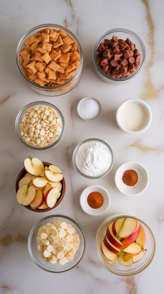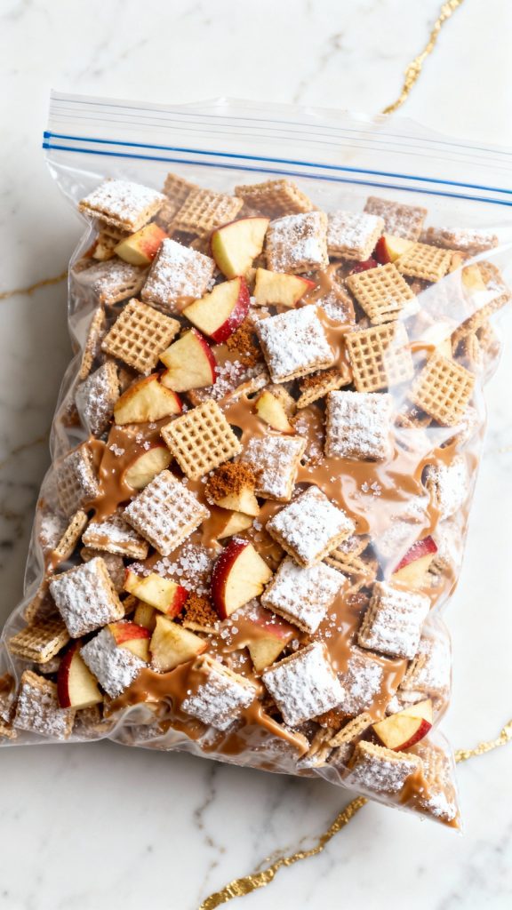 Chex cereal is super light and porous, so it soaks up that melted caramel and chocolate coating really well without getting soggy. The powdered sugar sticks to the chocolate layer to add sweetness and stop things from clumping. Freeze-dried apples give that apple flavor without adding moisture—key for keeping the mix crunchy.