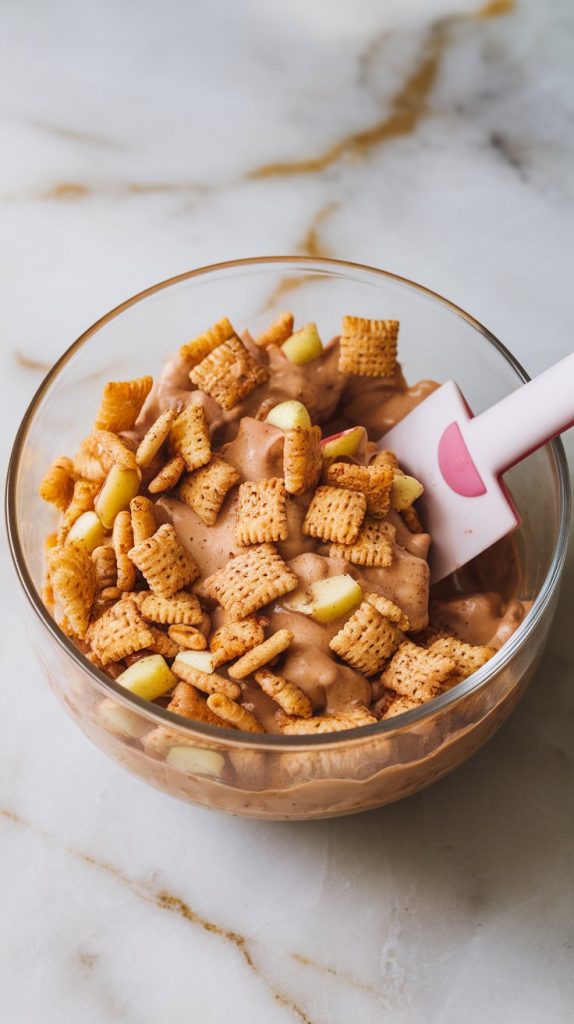 Add ¾ cup chopped freeze-dried apples, 1 teaspoon apple pie spice, and ¼ teaspoon salt to the coated cereal. Stir gently to distribute everything evenly.