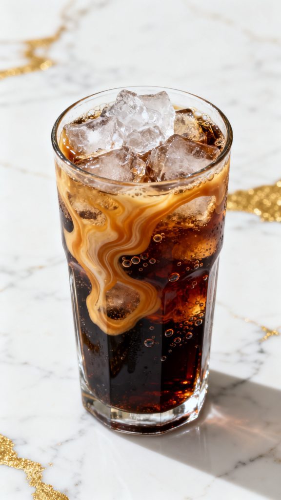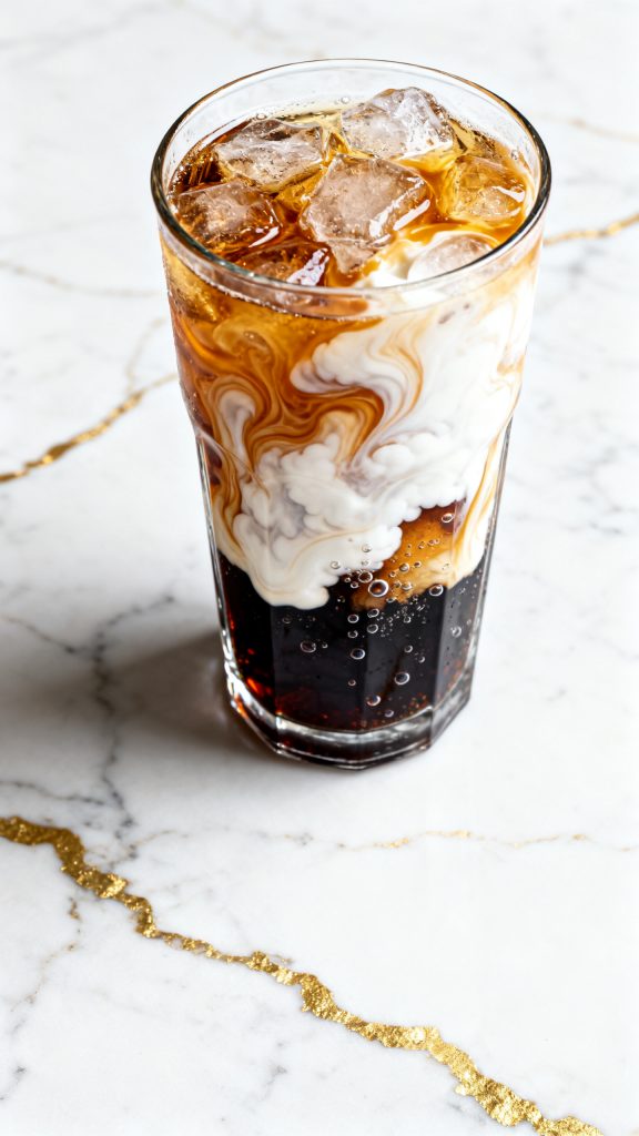 Pour 2 tbsp heavy cream gently into the glass. Let it swirl naturally for that marble effect.