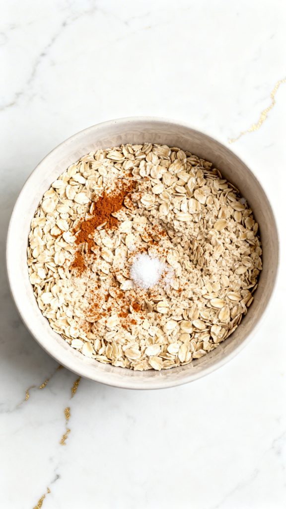In a medium bowl, add 1 cup rolled oats, ¼ teaspoon ground cinnamon, and a pinch of salt. Stir them together so the spices are evenly spread through the oats.