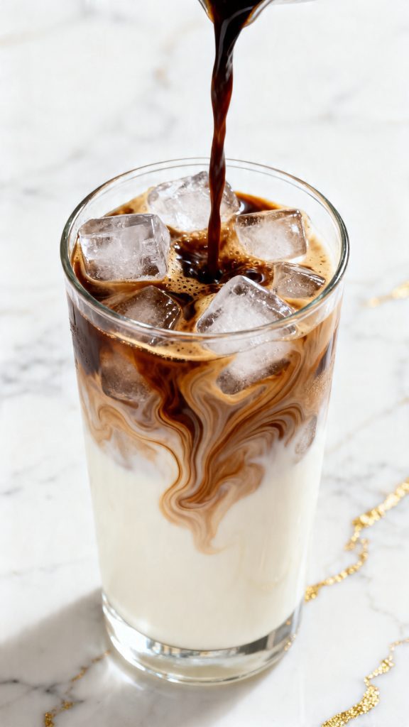 Brew 2 shots espresso, about 2 ounces total. Set it aside for 1 to 2 minutes so it is still warm but not piping hot. This helps the ice hold up a little better and keeps the drink from watering down too fast.