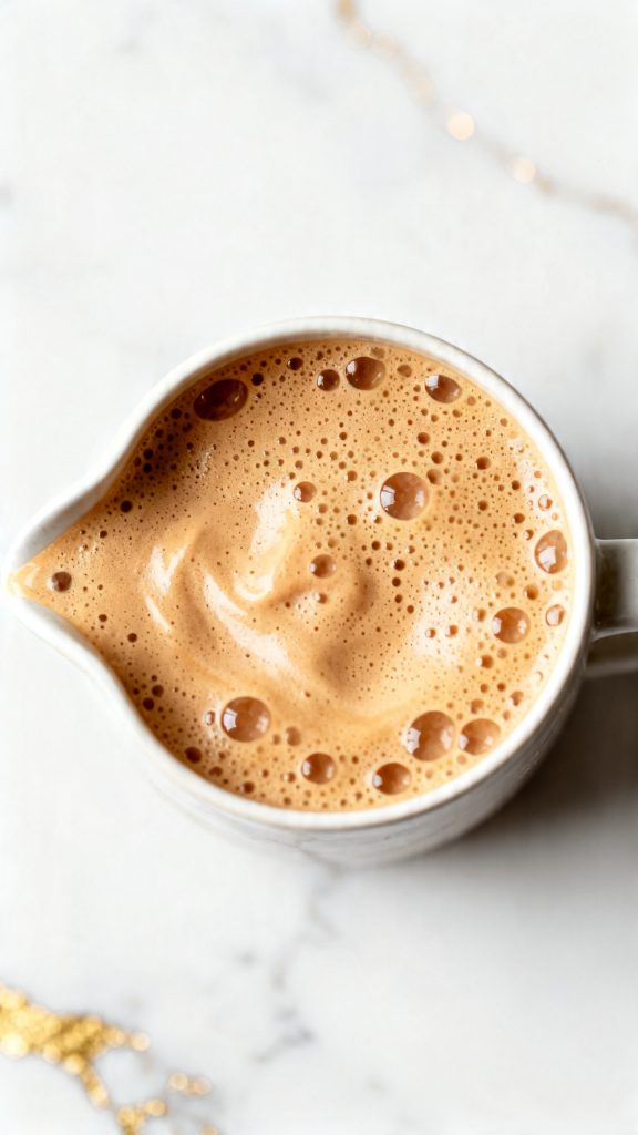 In a small pitcher or jar, add 1/4 cup heavy cream, 2 tablespoons milk, 1 tablespoon caramel sauce, and 1 teaspoon vanilla syrup. Froth for 20 to 30 seconds until the mixture is thick, creamy, and pourable. It should look silky and airy, not stiff.