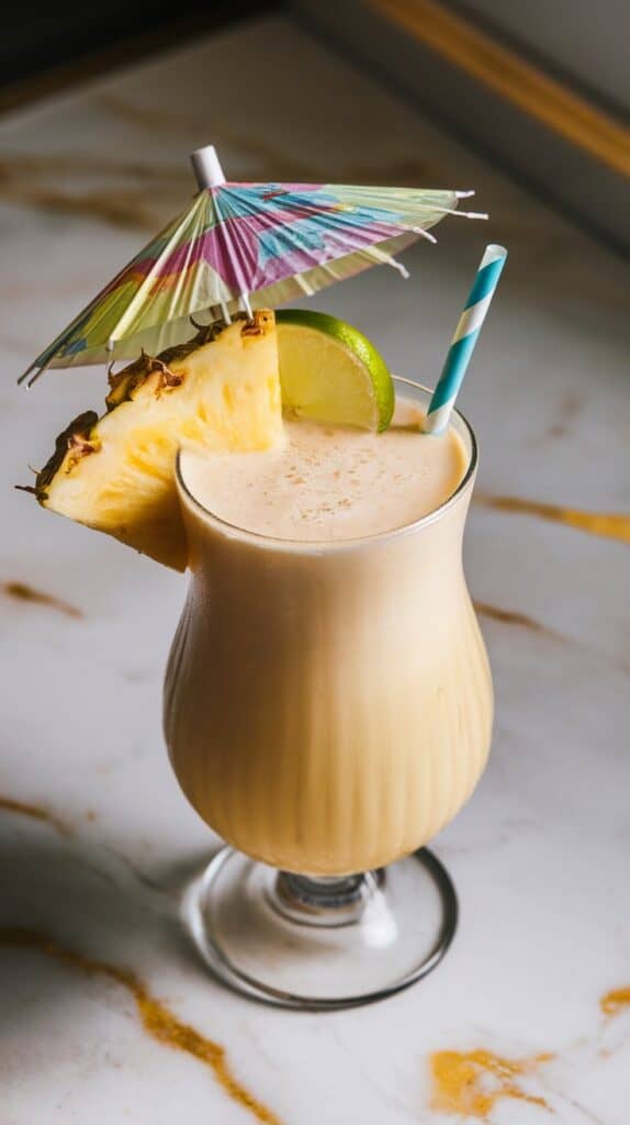 Details: Pour the frozen mixture into two chilled hurricane glasses. Garnish with a pineapple wedge, lime wheel, and maybe a fun umbrella!