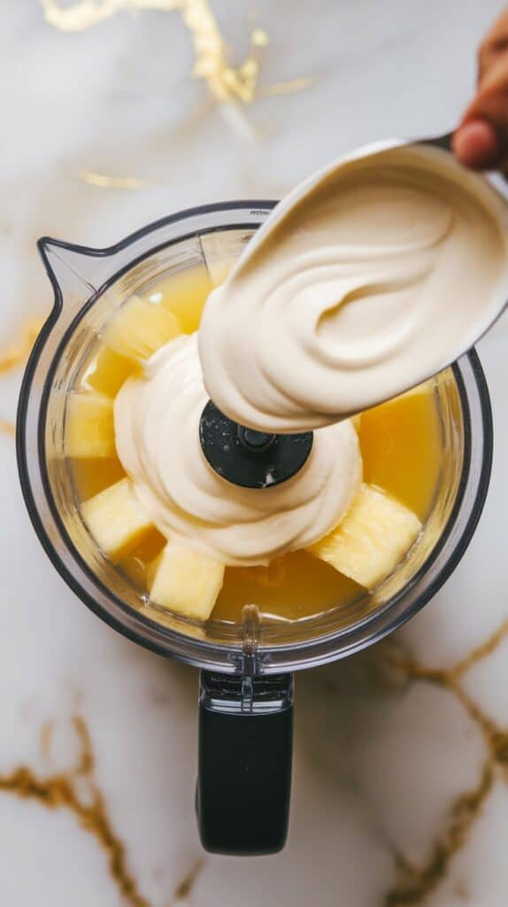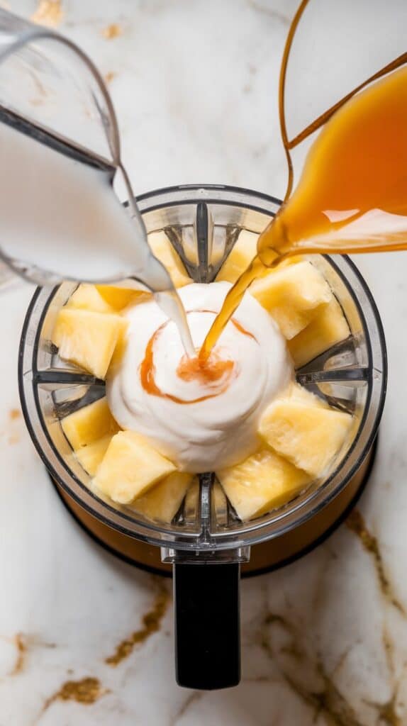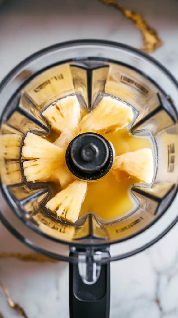 Details: Pour 1 ½ cups of fresh pineapple juice and 2 tablespoons of fresh lime juice into the blender. This citrusy base adds brightness and tartness to balance the creamy coconut.
