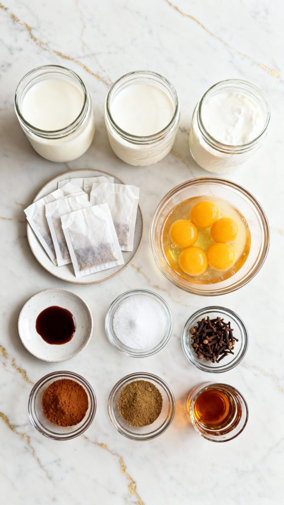 Heating the milk and cream with the chai bags allows the spices to steep deeply, giving full flavor. Tempering the egg yolks (adding hot milk slowly) prevents them from scrambling. As you cook the mixture to 160–165°F, it thickens into a rich custard. That’s what gives eggnog its classic creamy texture without needing cornstarch or thickeners.