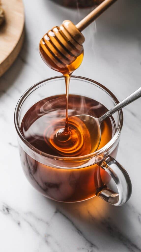 Add 1 tablespoon of honey to the hot tea. Stir well until fully dissolved.