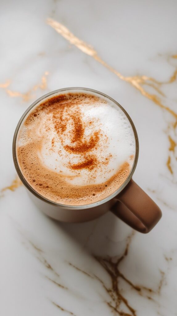 Pour your finished chai spice protein coffee into a cozy mug. Top with milk foam, and sprinkle a little extra cinnamon on top if you like. Serve hot.