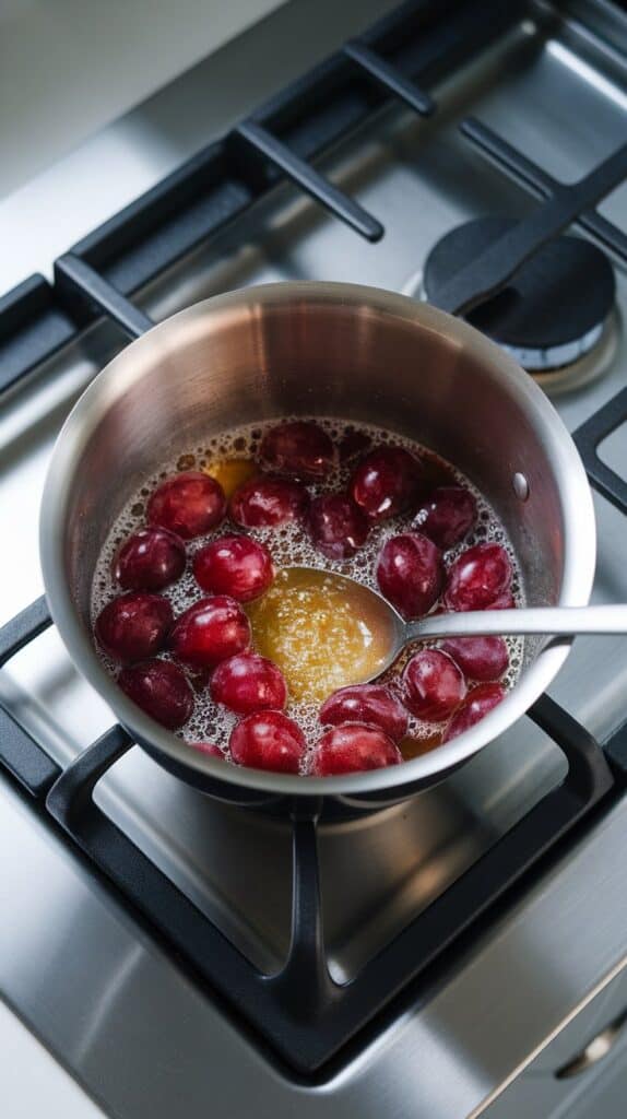 In a small saucepan, heat the halved grapes over medium heat, mashing with a spoon until juicy (about 5 minutes). Strain through a fine mesh sieve to remove skins. Let cool, then stir in honey.