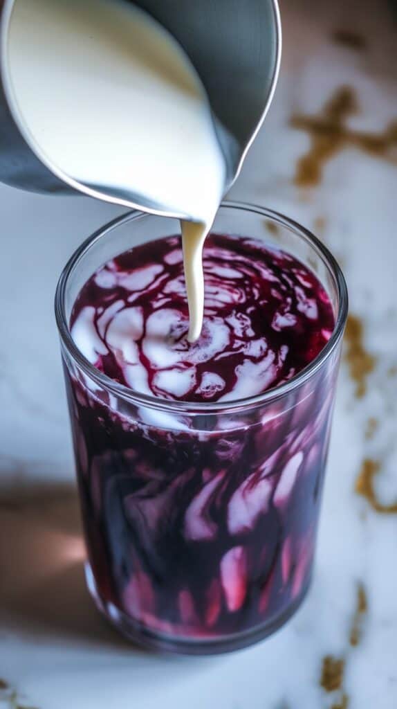Pour in about ¼ cup of cold milk per glass. Watch the dreamy swirls.