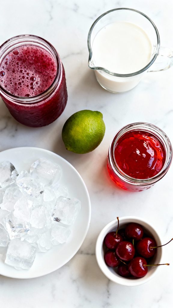 The carbonation from the soda lifts and blends the flavors quickly. The half-and-half brings in fat, which mellows out the acid from the lime and sharpness of the soda. Cherry juice adds color, flavor, and sweetness, while lime juice cuts through the richness for balance. Crushed ice helps keep the temperature low and blends better than cubes.