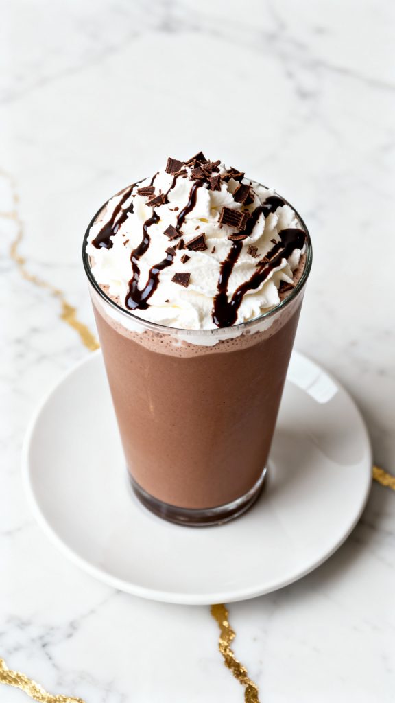 Pour the shake into a tall glass. Top with whipped cream, extra chocolate syrup, and shaved chocolate.