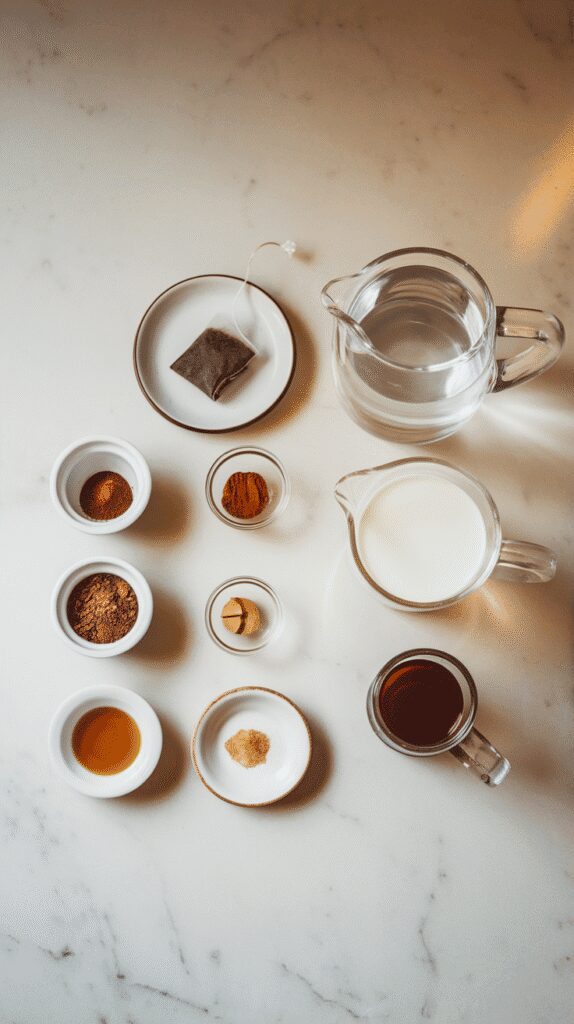 In a small saucepan, bring ½ cup water to a simmer. Add 1 black tea bag, ¼ tsp cinnamon, a pinch of cardamom, and a pinch of ginger. Let steep for 3–4 minutes.