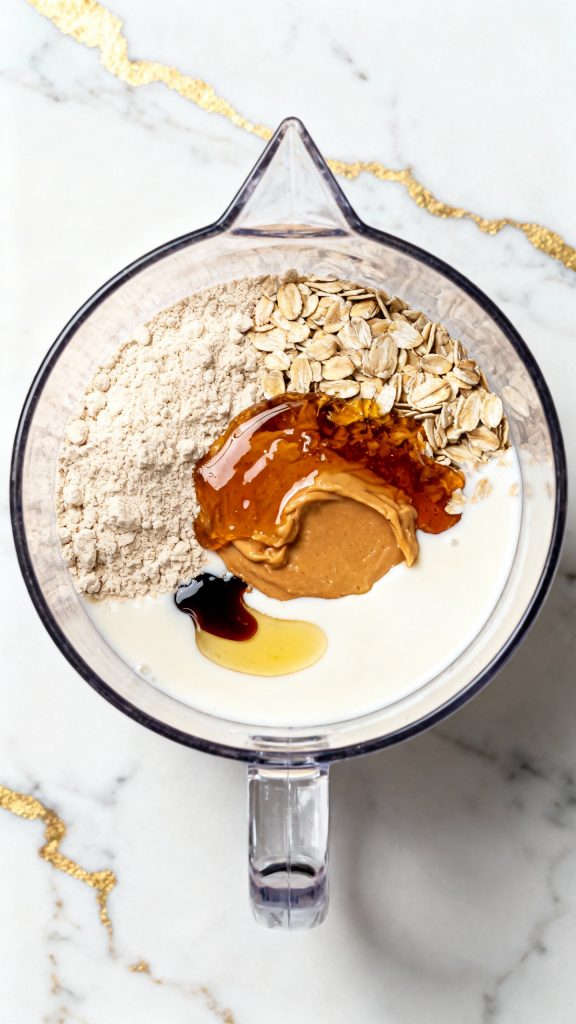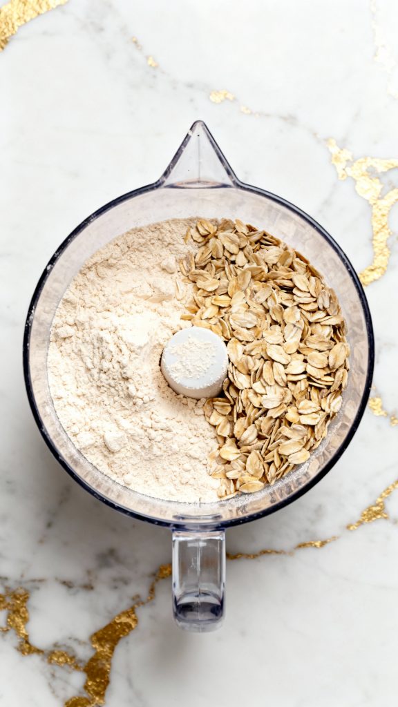 Add 1 scoop vanilla protein powder and 1 tbsp quick oats into the blender.