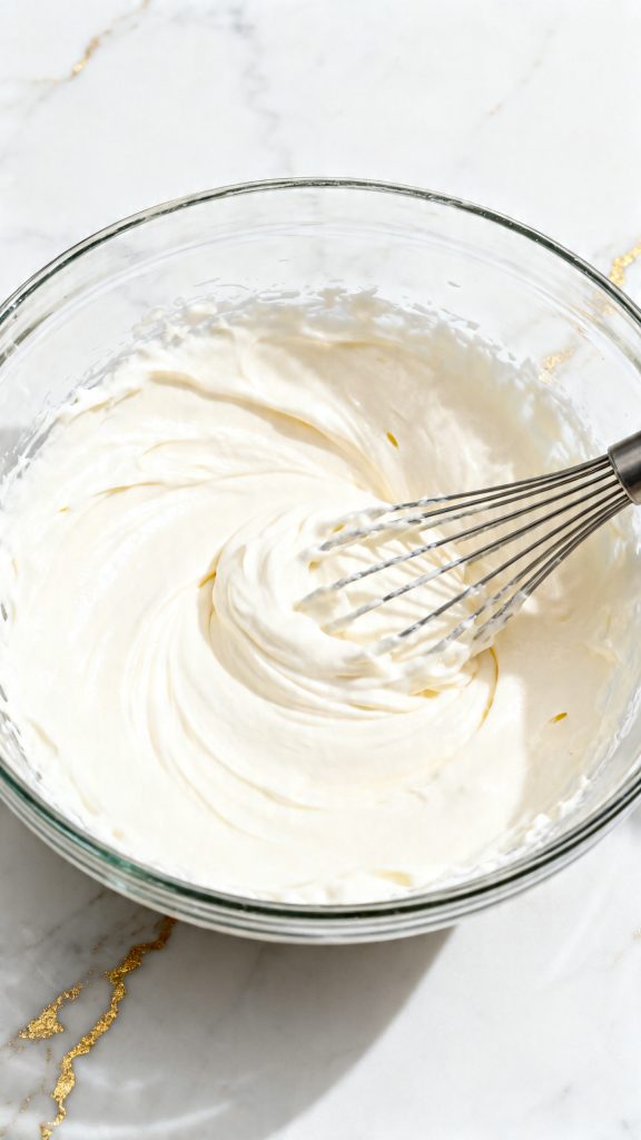 In a medium mixing bowl, add 2 cups full-fat plain Greek yogurt, 3/4 cup cold heavy cream, 1/2 cup granulated sugar, 2 tablespoons light corn syrup, 1 1/2 teaspoons vanilla extract, and 1/8 teaspoon fine salt. Whisk until the sugar is fully mixed in and the base looks smooth and creamy. This takes about 1 to 2 minutes. The mixture should look silky, with no streaks of cream and no dry sugar sitting at the bottom.