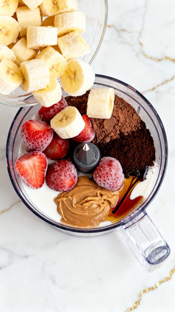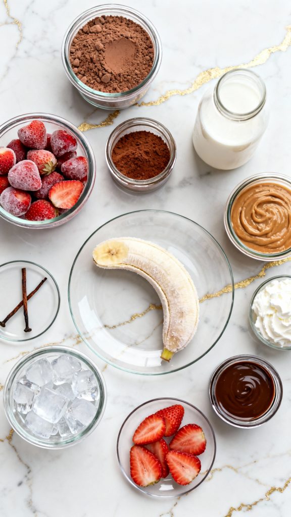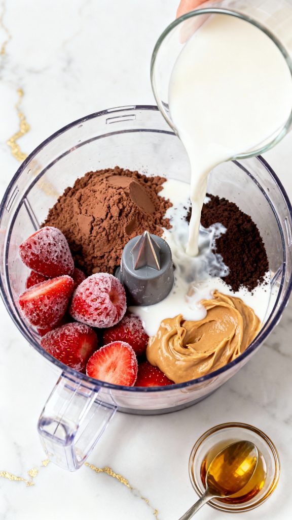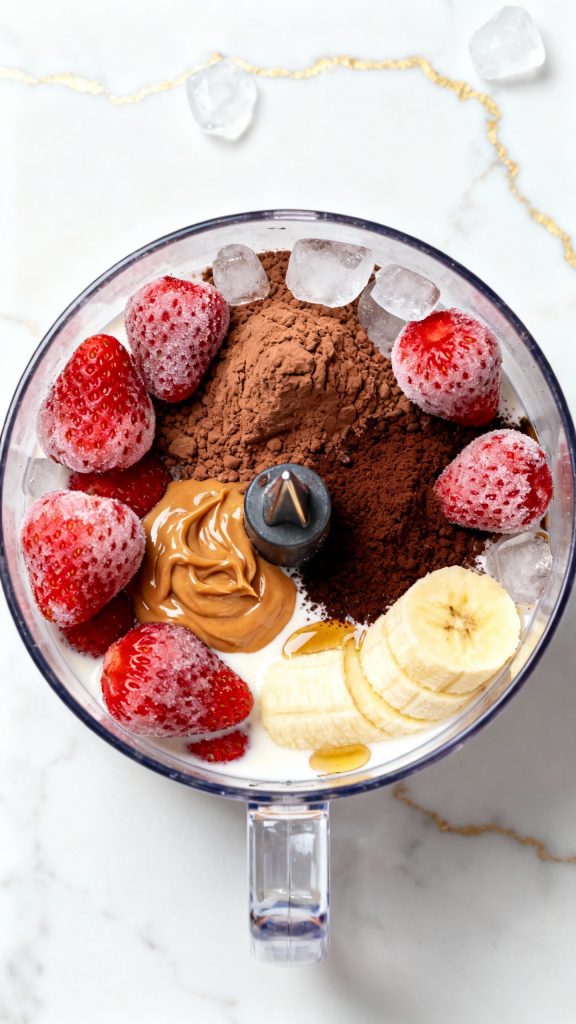 The frozen strawberries and banana thicken the shake without needing ice cream. Chocolate protein powder blends flavor with function, and almond butter adds healthy fat to make it satisfying. Cocoa powder boosts chocolate flavor, and a touch of vanilla brings it all together.