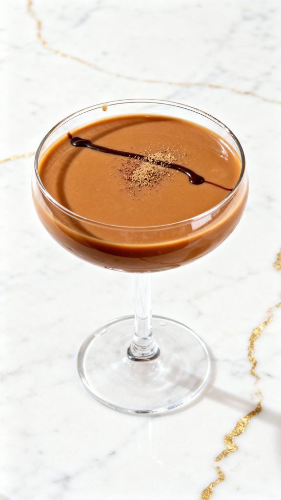 Strain the drink into a coupe glass, garnish with chocolate syrup drizzle and a pinch of nutmeg or cocoa powder.
