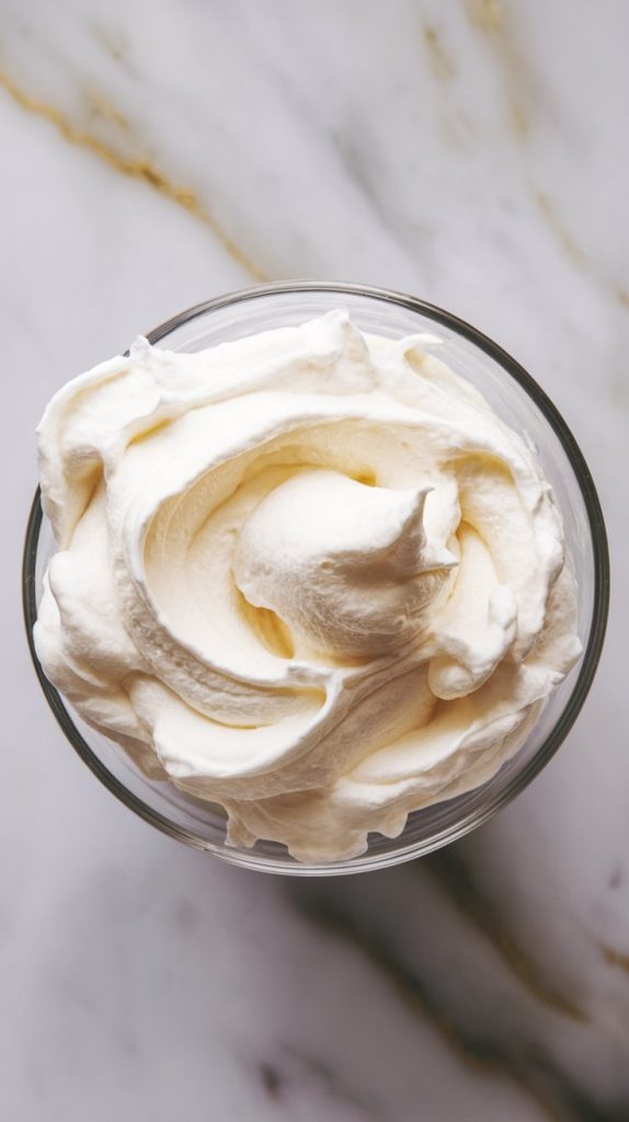 In another bowl, whip 1 cup heavy cream with 2 tbsp powdered sugar using an electric mixer on medium-high speed until stiff peaks form.