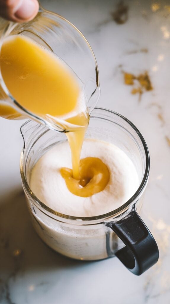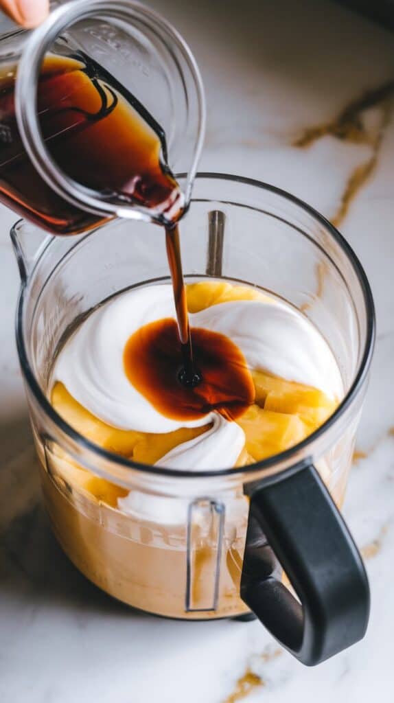 Pour in 1/3 cup of pineapple juice. It adds that bright, tropical flavor and balances the richness of the cream.