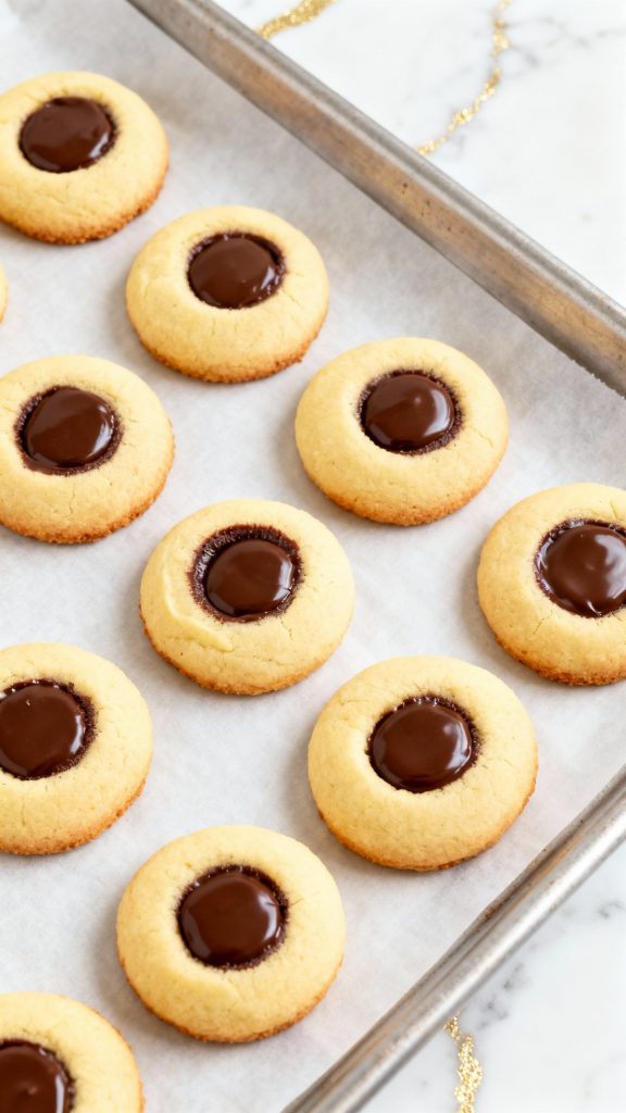 This cookie base has a high fat-to-flour ratio, which gives you that soft, melt-in-your-mouth texture. Pressing the center before baking makes space for the chocolate filling, and adding cream to the chocolate helps it stay smooth and shiny. The sugar coating adds a little crunch and sparkle on the outside—bonus texture!
