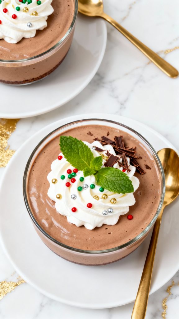 Top each mousse cup with whipped cream, holiday sprinkles, a mint leaf, and optional chocolate shavings right before serving.