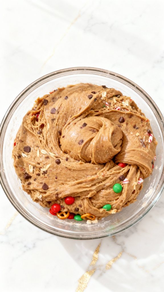 Fold in 1 cup semi-sweet chocolate chips, 1 cup red and green M&Ms, ¾ cup oats, ½ cup crushed pretzels, and ½ cup crushed candy canes.