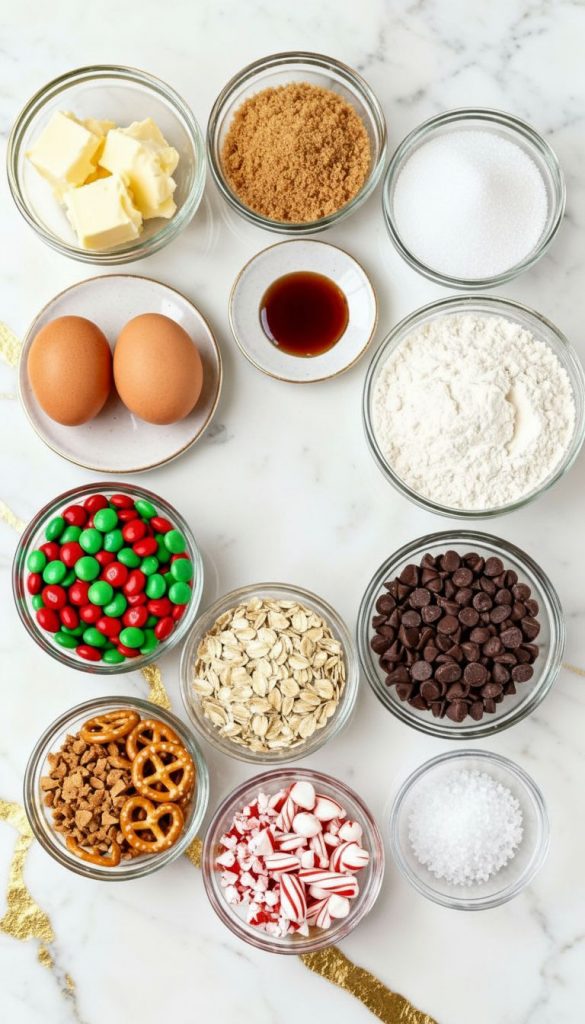 Pretzels, red and green M&Ms, crushed candy canes, chocolate chips, oats—literally everything but the kitchen sink.