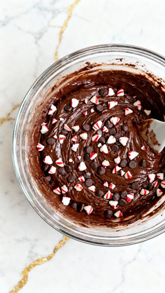 Add 1 cup chopped peppermint bark and 2 tbsp mini chocolate chips (if using). Fold in gently.