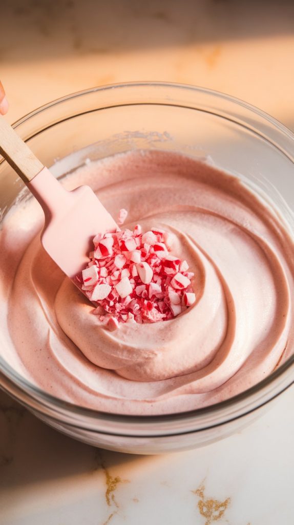 Add 1/3 cup crushed peppermint candies and fold them in until evenly mixed.