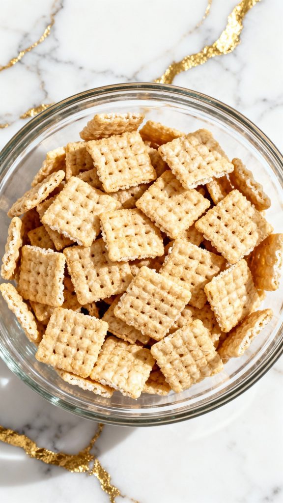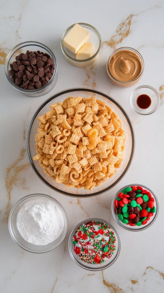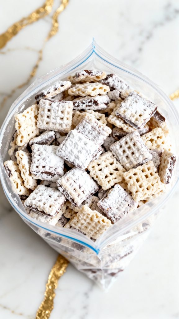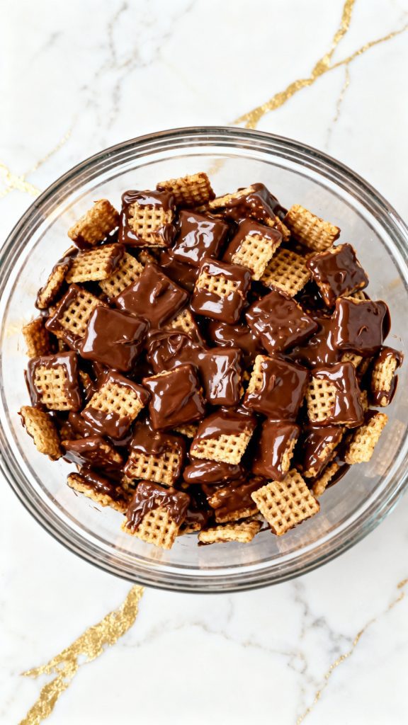 Rice Chex cereal holds its shape and texture really well because it’s made with rice flour and has a firm crunch. When you coat it with melted chocolate, peanut butter, and butter, it gets a rich layer that hardens slightly as it cools. The powdered sugar helps keep it from sticking and gives that sweet finish without making it soggy.