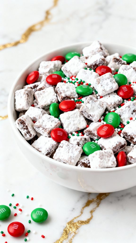 Pour the puppy chow into a clean bowl. Add 1 cup red and green M&M’s and 1/2 cup holiday sprinkles. Gently stir to combine.