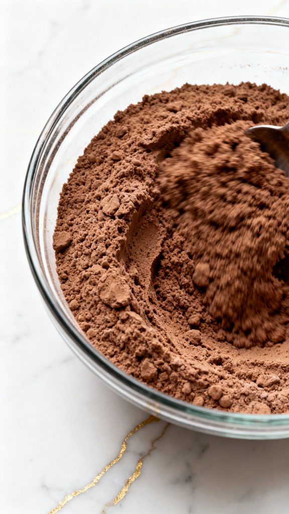 In a bowl, sift together 3/4 cup all-purpose flour, 1/4 cup cocoa powder, 1 tsp baking powder, and 1/4 tsp salt. Set aside.