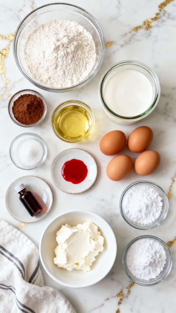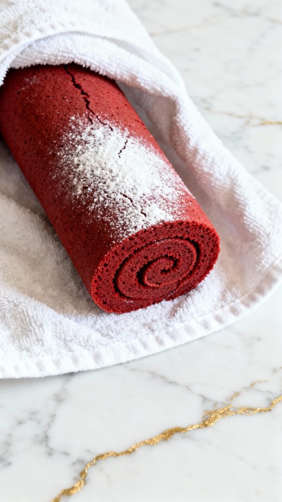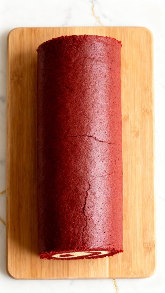 This cake uses whipped eggs for structure instead of butter or lots of flour. That makes it light and spongy—perfect for rolling without cracking. The red food coloring gives the iconic red velvet look, while the cocoa adds that subtle chocolate flavor. Cream cheese and whipping cream make the filling rich but fluffy.