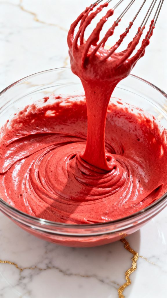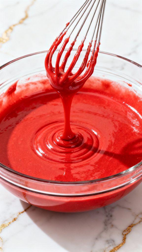 Mix in 1 tbsp red gel food coloring, 1 tsp vanilla extract, and 2 tbsp vegetable oil until fully blended.