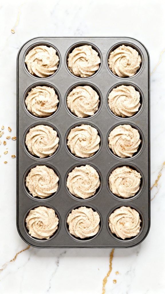 Spoon the batter into the prepared mini muffin pan, dividing it evenly among 12 cups. Fill each one almost to the top. The batter should look thick and spoonable, not runny.