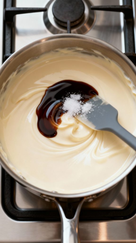 Turn off the heat and stir in 1 tsp vanilla extract and ½ tsp salt. Mix well.
