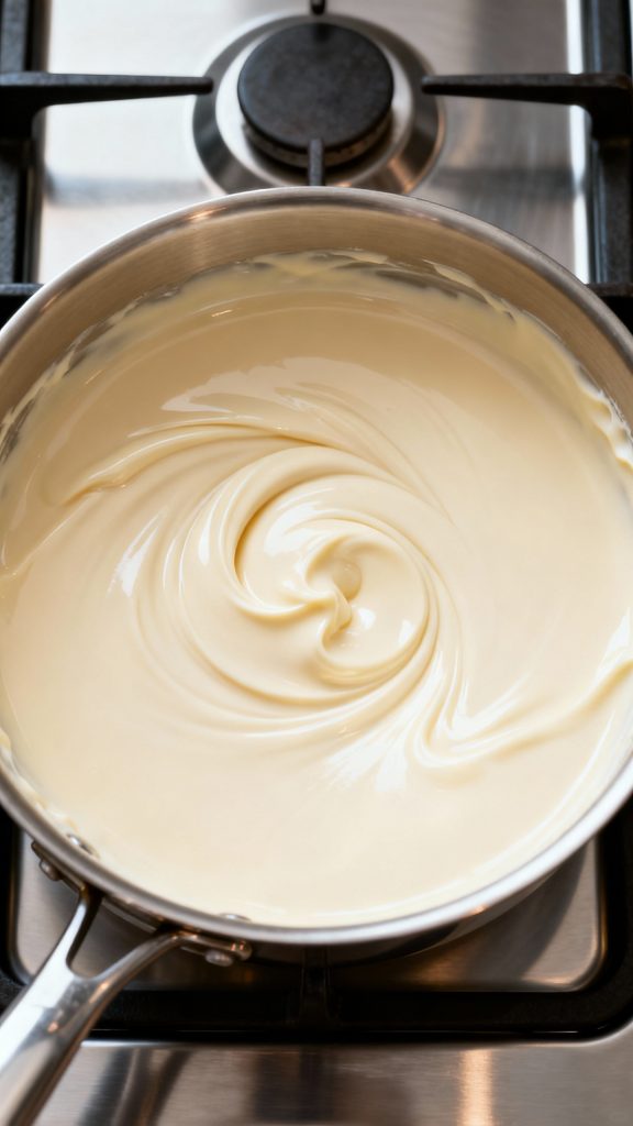 In a medium nonstick saucepan over low heat, add 3 cups white chocolate chips and 1 can (14 oz) sweetened condensed milk. Stir constantly until smooth and fully melted.