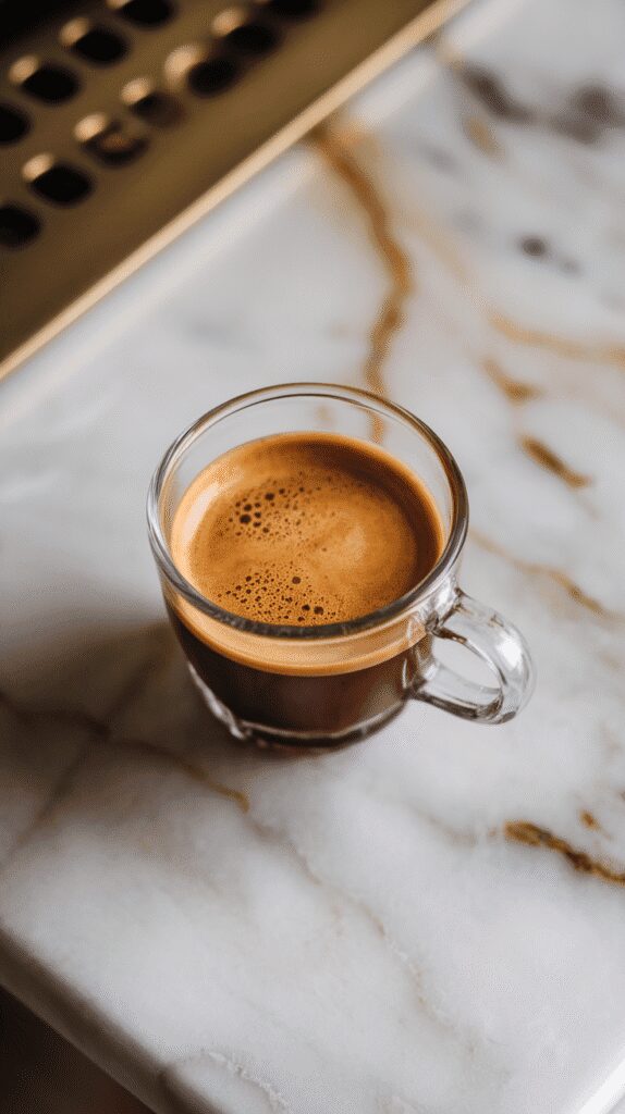 📸 Image Prompt: Ultra close-up of freshly brewed espresso in a small glass cup, rich crema on top, cooling on a white marble counter with hints of gold, all-natural lighting, taken with an iPhone 15 Pro, top-down shot used by recipe bloggers.