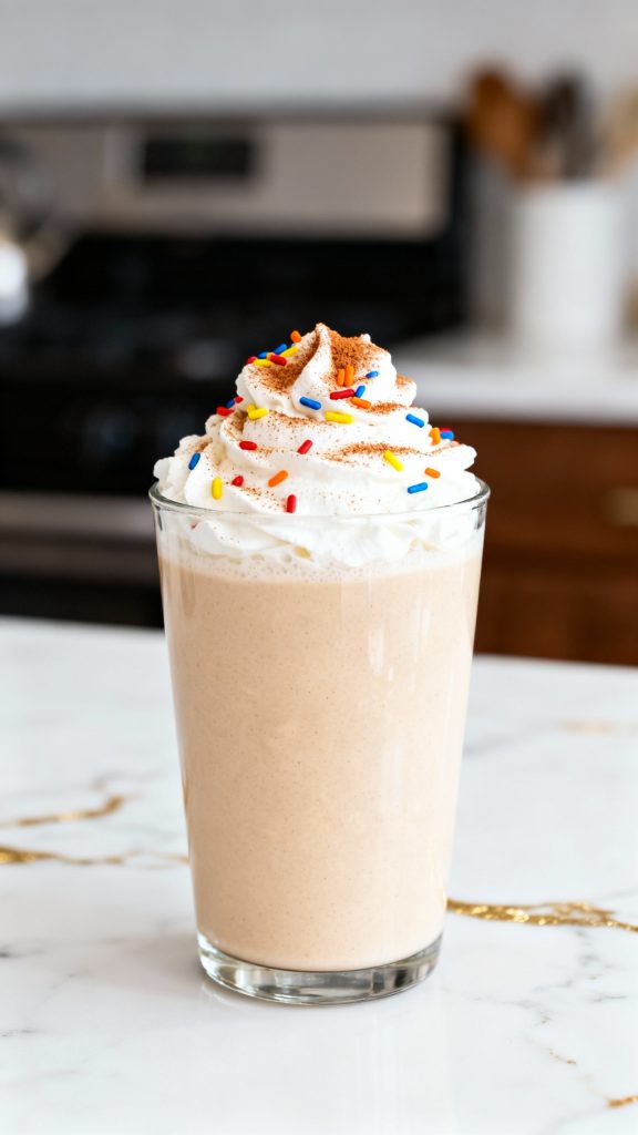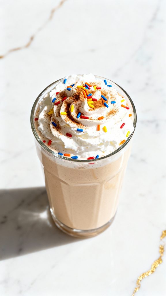 Pour the shake into a tall glass. Top with whipped cream and a pinch of rainbow sprinkles if you want a treat-style finish.