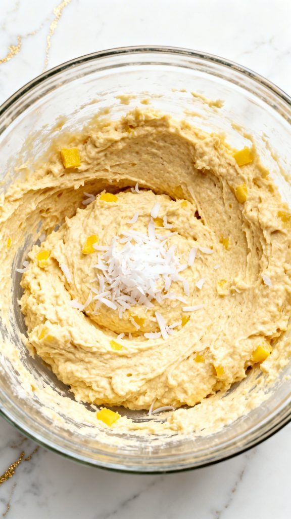 Add 1 3/4 cups flour, 1/2 cup shredded coconut, 1 teaspoon baking powder, 1/2 teaspoon baking soda, 1/4 teaspoon salt, and remaining 1/2 cup diced pineapple. Stir until thick batter forms.