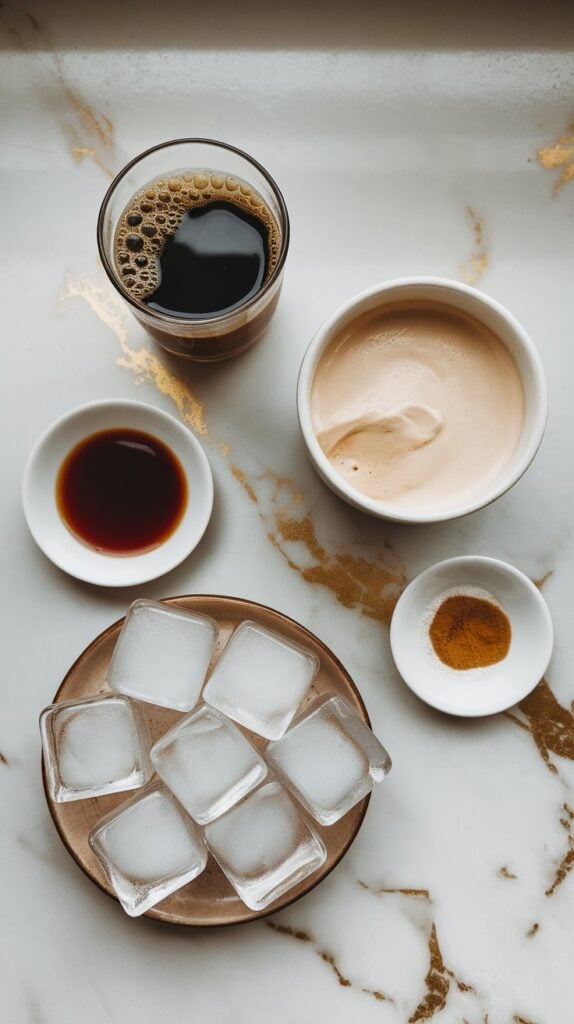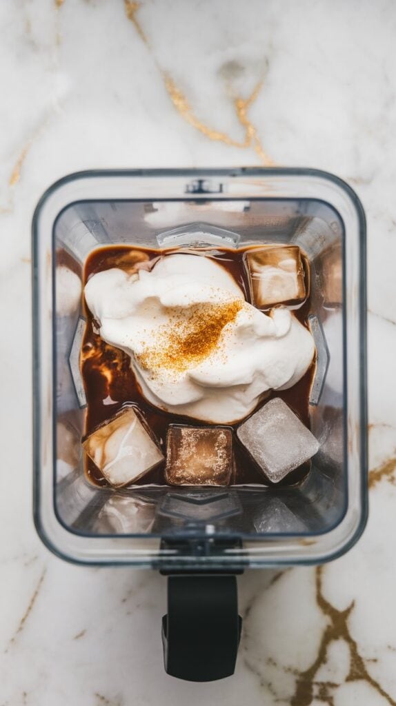 Pour your cooled coffee, coconut cream, vanilla extract, ice cubes, and sweetener into the blender.