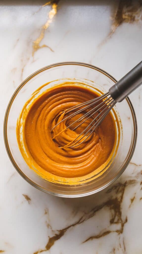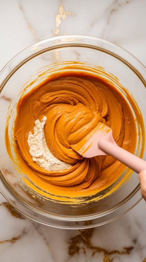 In another bowl, whisk together ¾ cup canned pumpkin puree, ½ cup packed brown sugar, ½ cup granulated sugar, ½ cup vegetable oil, 2 large eggs, and 1 tsp vanilla extract until smooth.