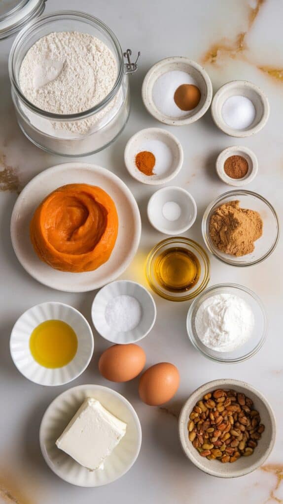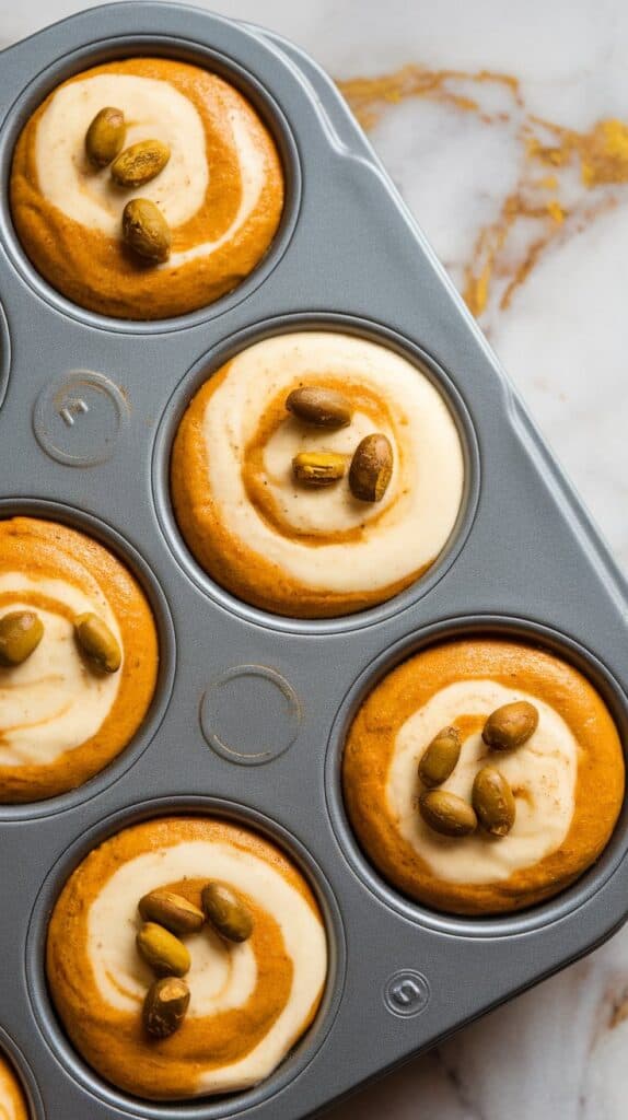 Pumpkin puree adds both moisture and structure thanks to its fiber. Brown sugar adds a deeper molasses flavor and helps keep the muffins soft. Oil makes them tender, while the eggs give structure. The cream cheese filling bakes into the center without leaking because it’s thickened with powdered sugar. The pepitas toast while baking, adding crunch on top.