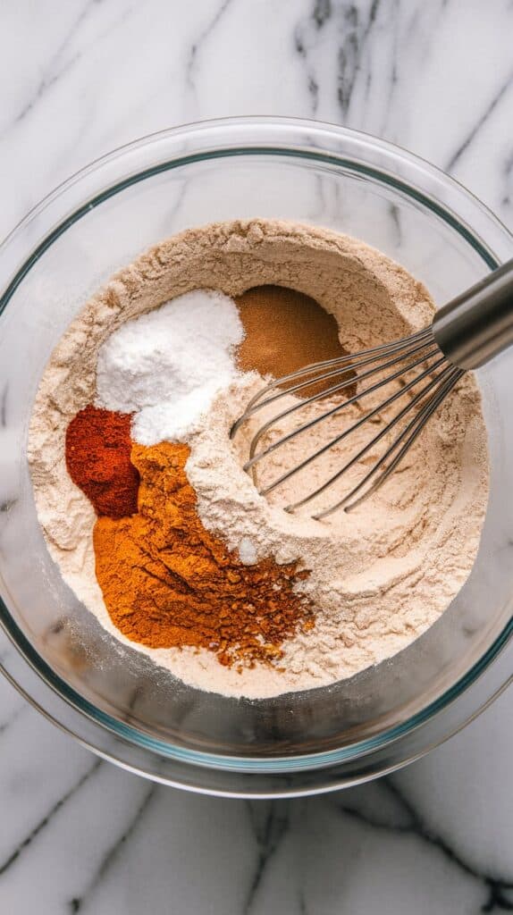 In a large bowl, whisk together 1 ¾ cups all-purpose flour, 1 tbsp pumpkin pie spice, ½ tsp baking soda, ½ tsp baking powder, and ¼ tsp salt until combined.