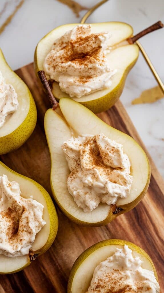 Use a small spoon to scoop out the seeds and core from each pear half. Make a small divot in the center so there’s room for filling.