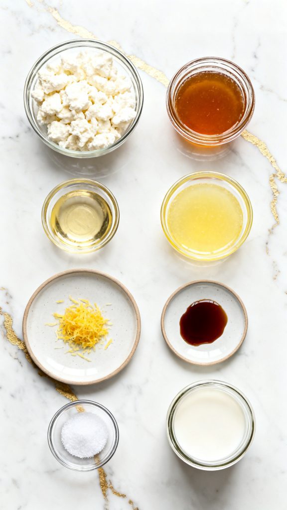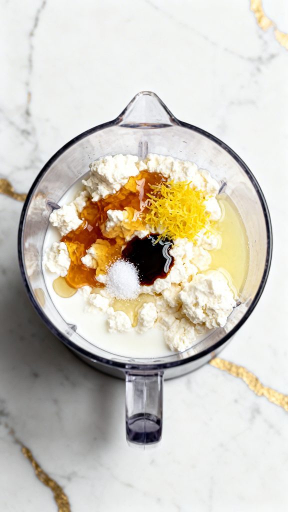 Add 2 cups cottage cheese, 1/3 cup honey, 2 tablespoons lemon juice, 1 teaspoon lemon zest, 1 teaspoon vanilla extract, 1 pinch salt, and 1/4 cup milk (optional) to a blender. Blend for about 45–60 seconds until the mixture becomes completely smooth and creamy with no visible curds.