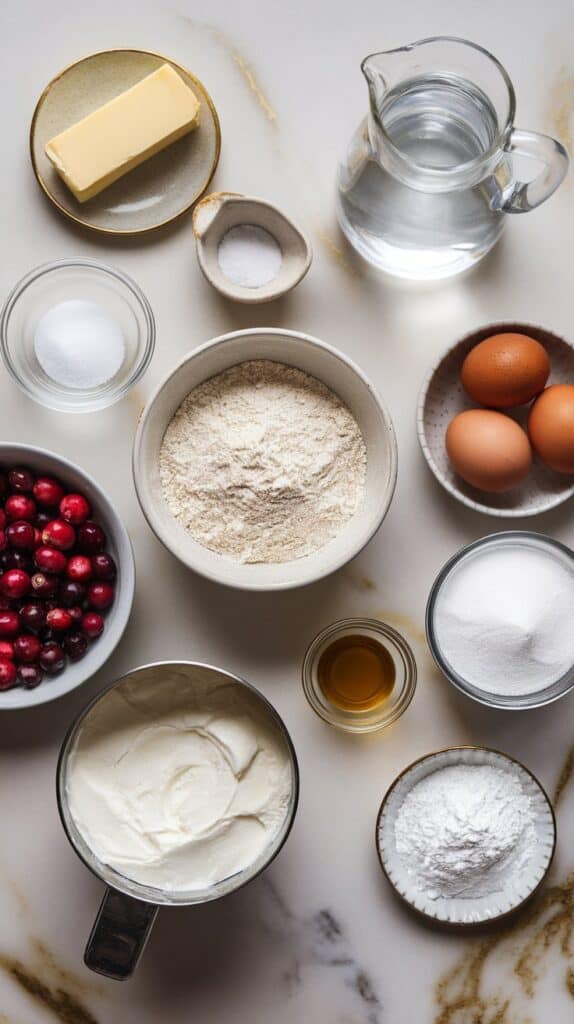Choux pastry puffs up because of steam — no baking powder or soda needed. The eggs create structure and moisture, which makes the dough rise in the oven. The cranberry filling adds a perfect contrast of tart to the sweet cream, and whipped cream keeps it light instead of heavy.