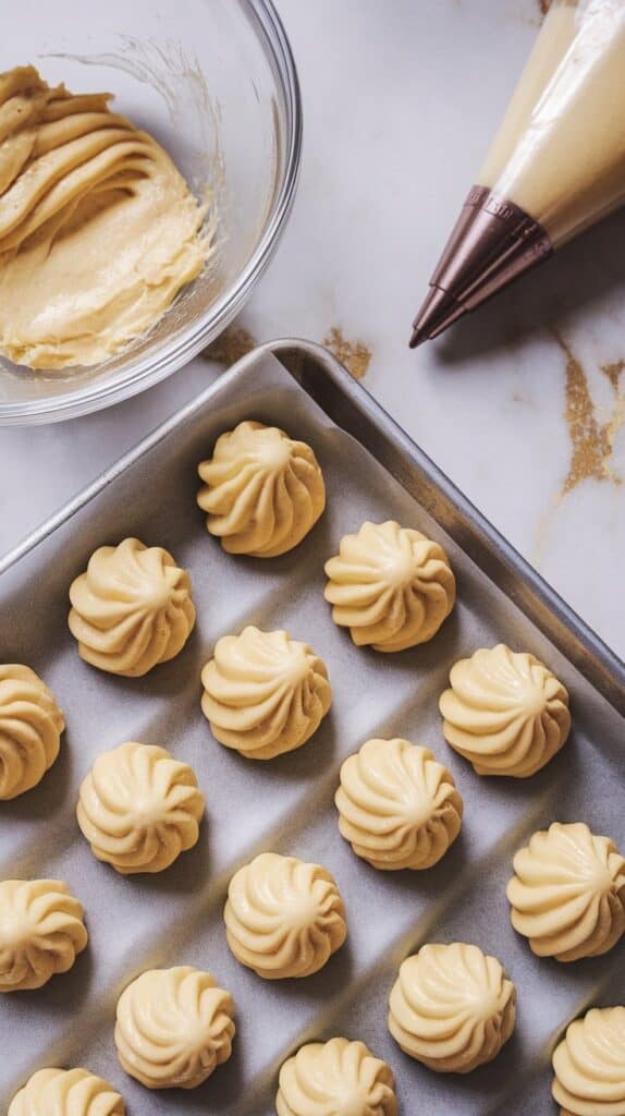 Preheat oven to 400°F (200°C). Line a baking sheet with parchment paper. Spoon the dough into a piping bag with a large round tip. Pipe 2-inch mounds onto the sheet, spacing them apart. Bake for 25–30 minutes until puffed and golden. Let cool completely.