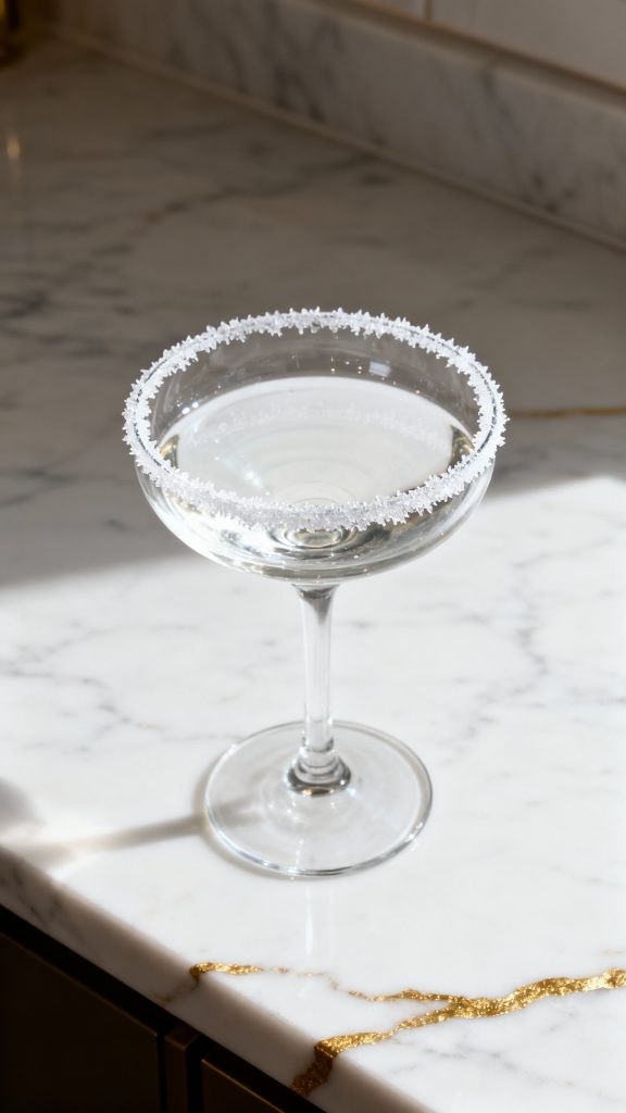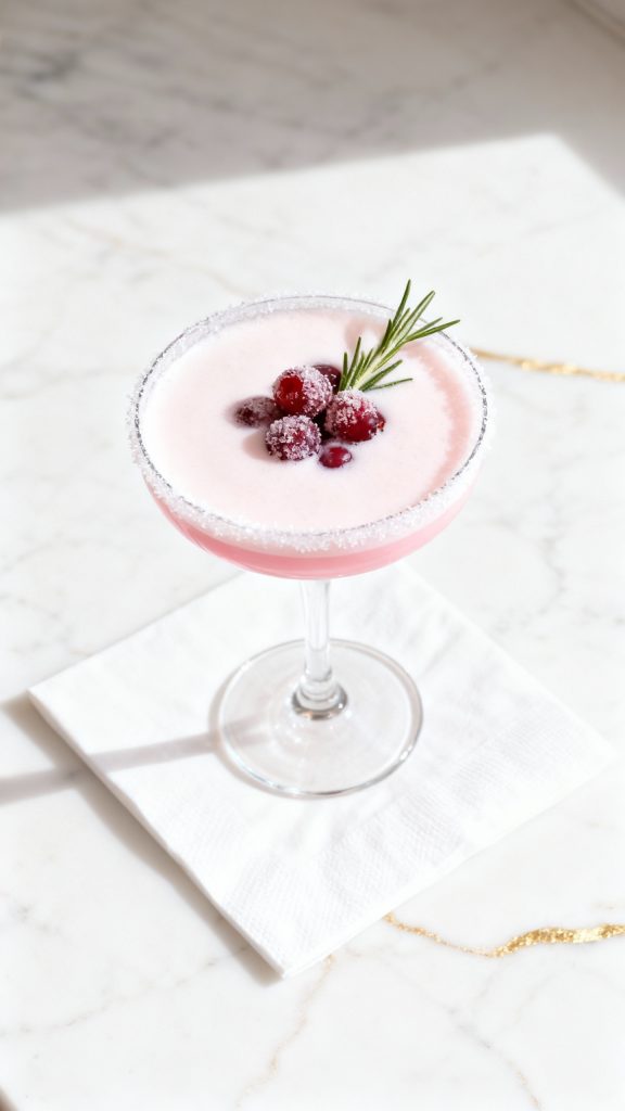 Strain into your sugar-rimmed coupe glass. Garnish with sugared cranberries and a rosemary sprig if you want to make it extra special.