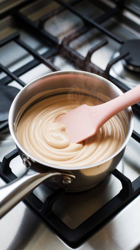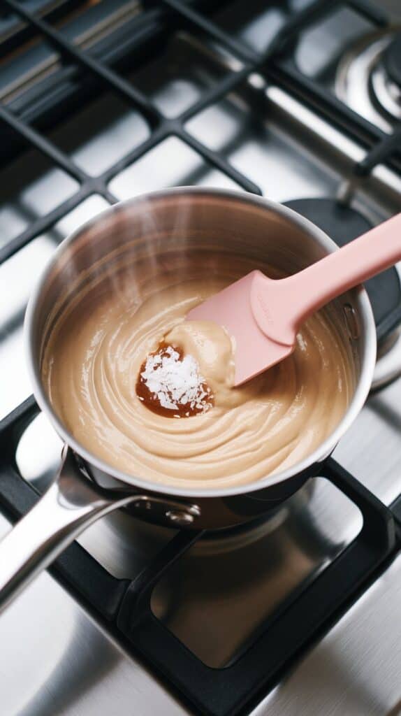 Once smooth, remove the saucepan from heat and stir in 1 tsp vanilla extract and 1/4 tsp salt until fully mixed in.